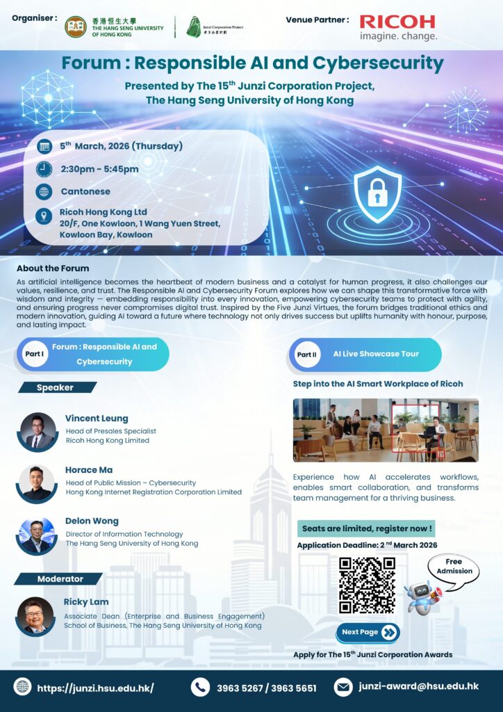 The event will be divided into two engaging parts. The first part is a forum, where three distinguished speakers and the moderator will explore Responsible AI and Cybersecurity from multiple perspectives. The second session is a live AI Showcase – Ricoh’s AI-powered Smart Workplace. Participants will experience firsthand how artificial intelligence accelerates workflows, enables intelligent collaboration, transforms team management, and ultimately drives business growth.